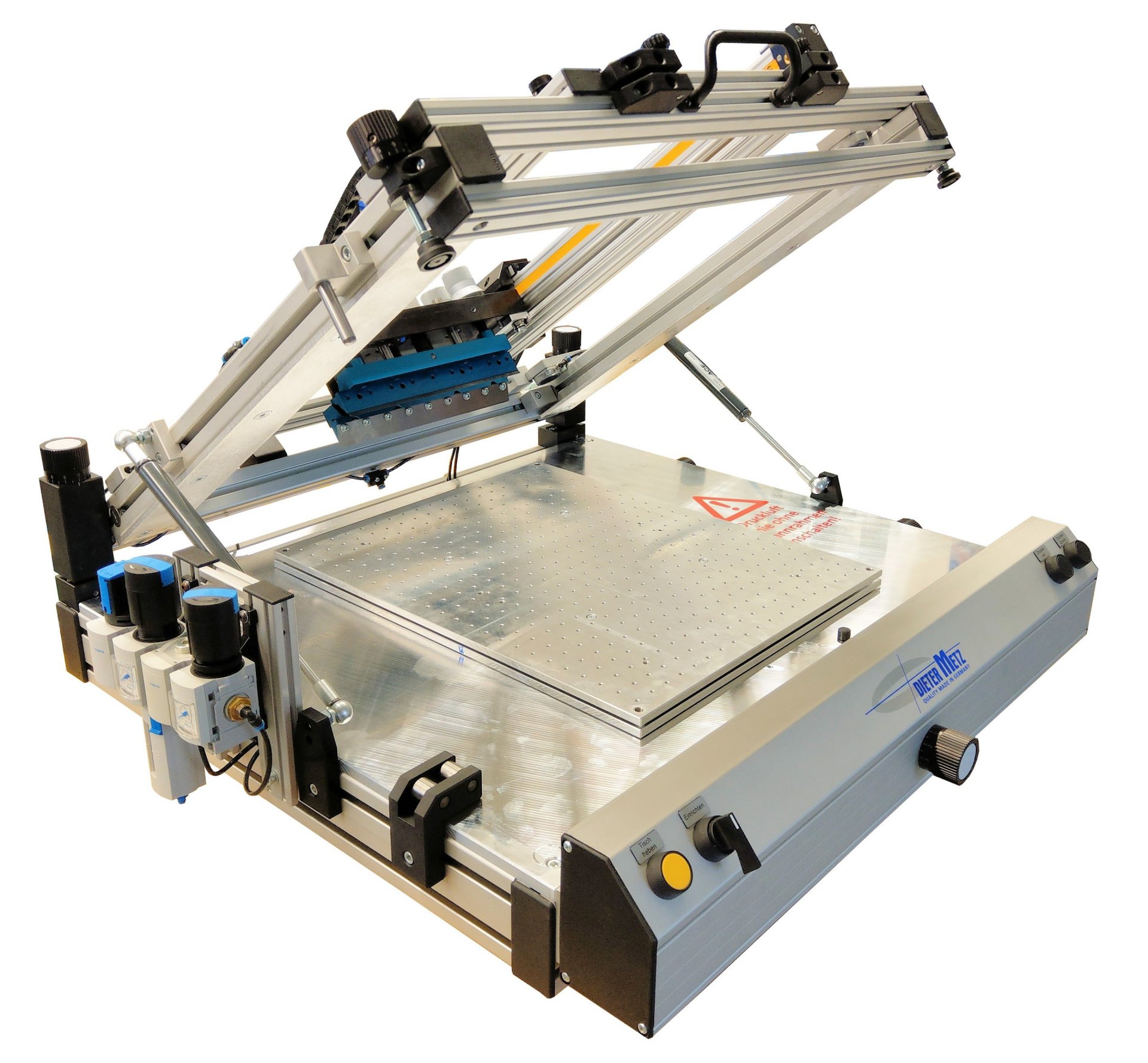 Unser Schablonendrucker R-RP-58/58AP ist ein halbautomatisches Drucksystem mit stabilem Rahmen aus ITEM-Profilsystemen und zeichnet sich durch eine sehr hohe Druckqualität aus.